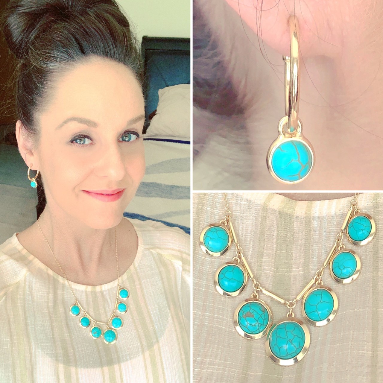Turquoise is always such a vibrant explosion of color with any outfit – sure to be a win! This particular necklace is set in goldtone, which lends a more upscale appearance to the stone. The necklace’s chain allows it to be cinched up to a collar necklace length, which is likely the length I’ll be wearing it at in the future. When it was at the length pictured, it worked best for the top I was wearing, but I would have preferred that the stones filled up more of the chain’s front-facing space…though I’m not opposed to wearing it under a blazer, cardigan or collared shirt that would hide more or all of the “naked” chain. The earrings are terrific! I love the medium size of the hoop and the mini-sized turquoise drop pendant still adds that shock of color, but doesn’t add actual weight to the earlobe!